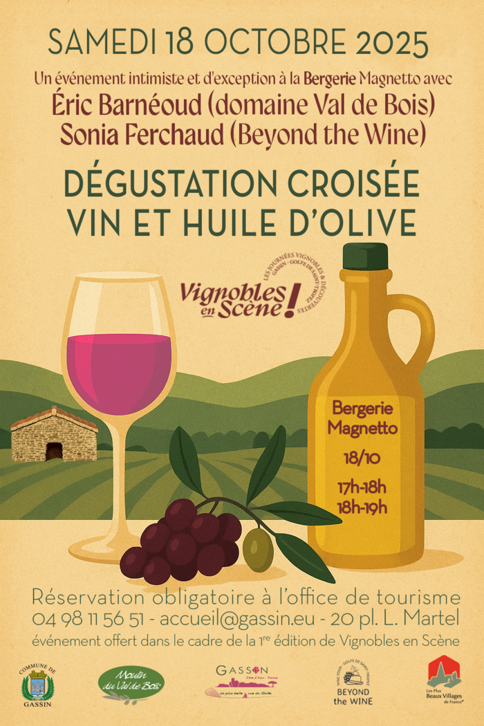 Rejoignez-nous pour une rencontre gustative où les vins, sélectionnés par Sonia Ferchaud, de l'agence Beyond The Wine, et l’huile d’olive du Domaine du Val de Bois, présentée par Eric Barnéoud se complèteront dans une parfaite harmonie. Ces experts partageront avec vous leur passion et leurs connaissances, vous offrant ainsi une immersion au cœur de leur métier et une découverte gustative unique.