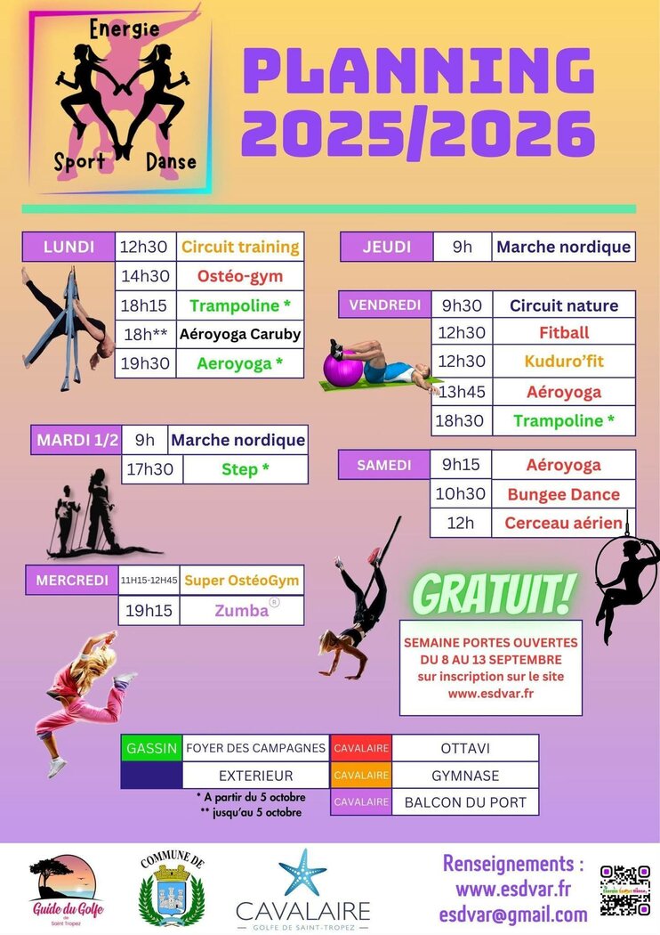 Vous trouverez différents cours comme le circuit nature, le trampoline, l'aéroyoga et plein d'autres activités.